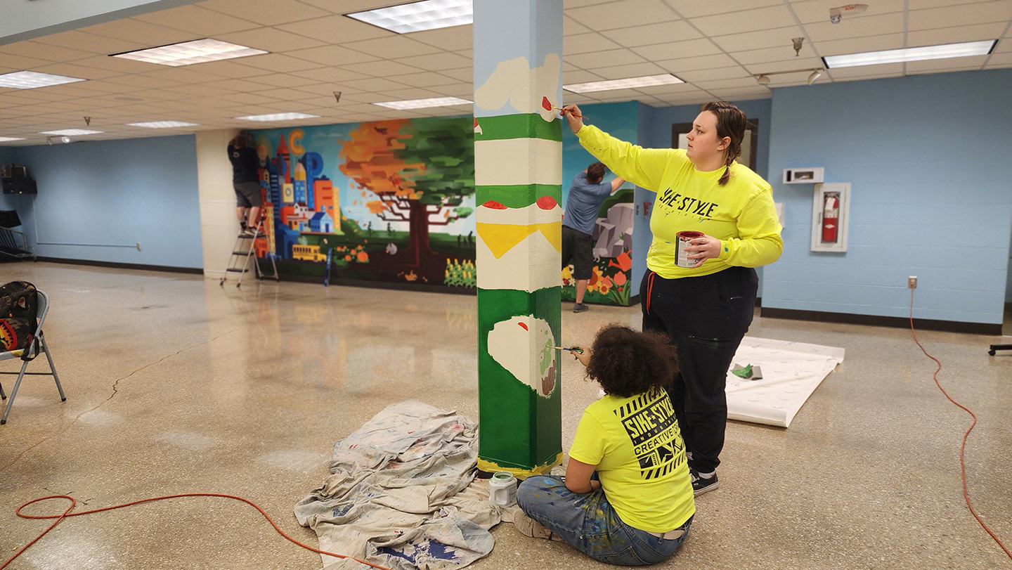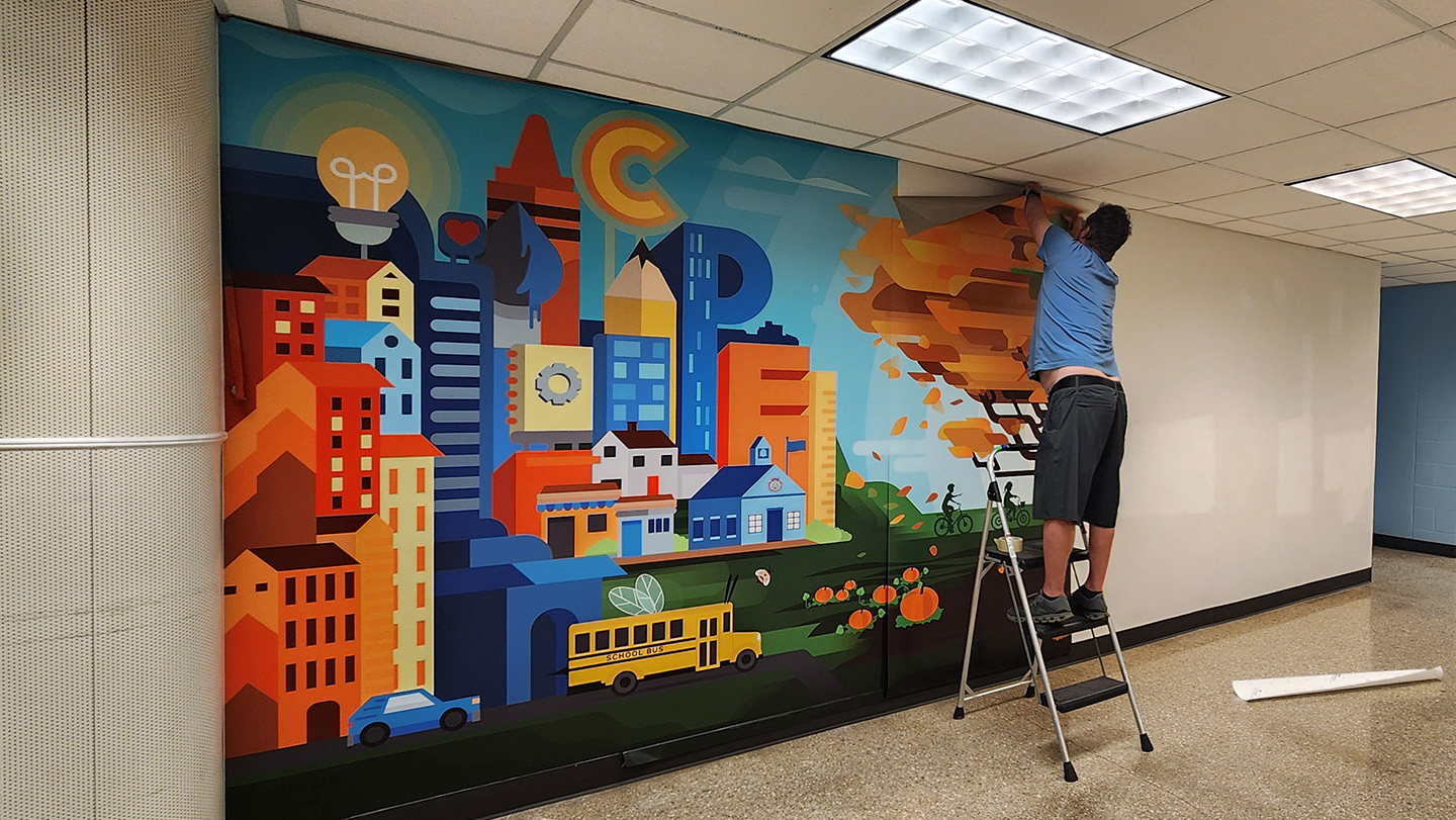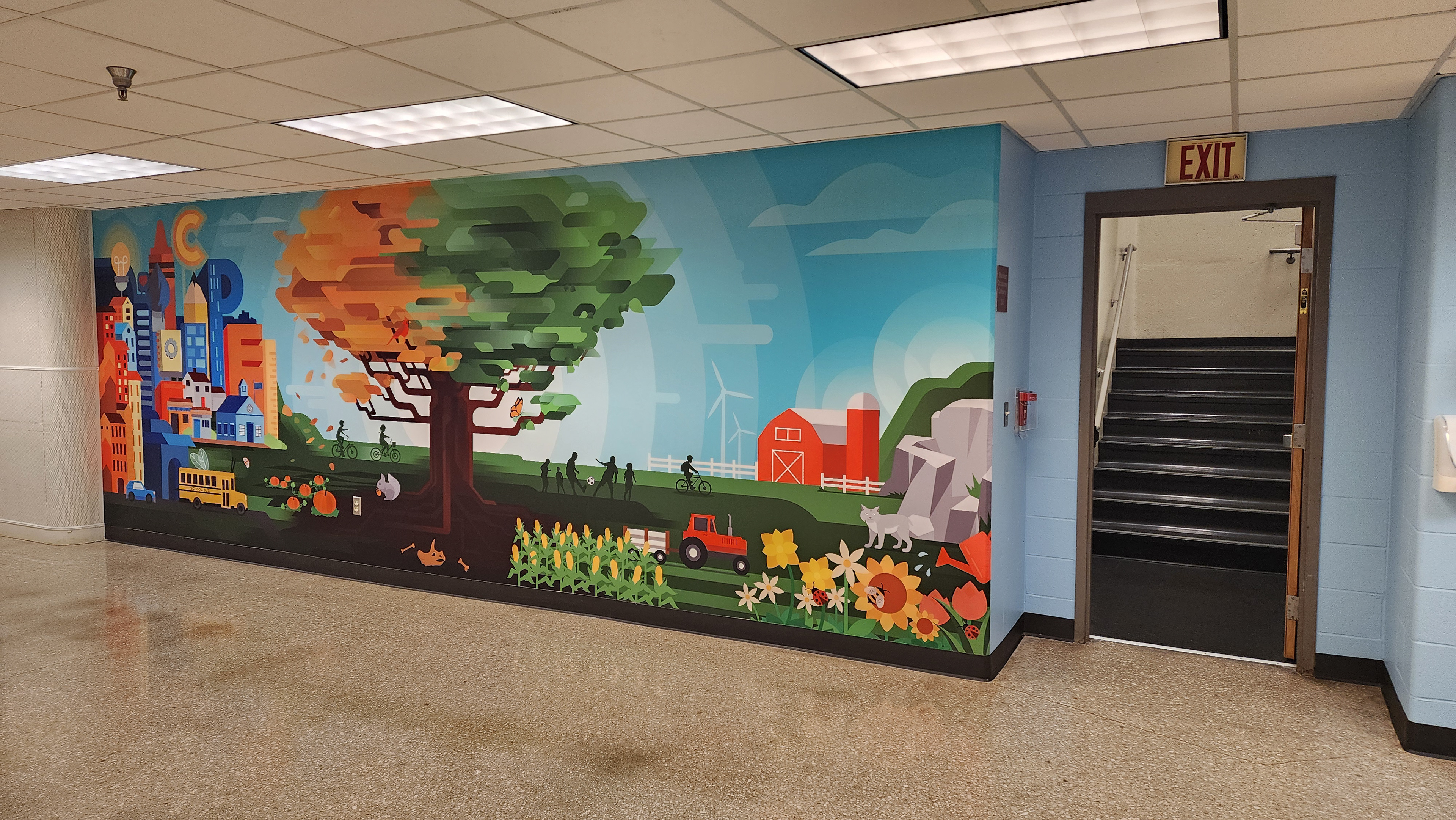 The wall design depicts a Cottonwood tree whose roots are strong, and leaves are making the transition from Summer to Fall. Other details include creative cityscapes, farming fields, neighborhood kids cycling and playing soccer, and the school's wildcat mascot hiding in the corner.