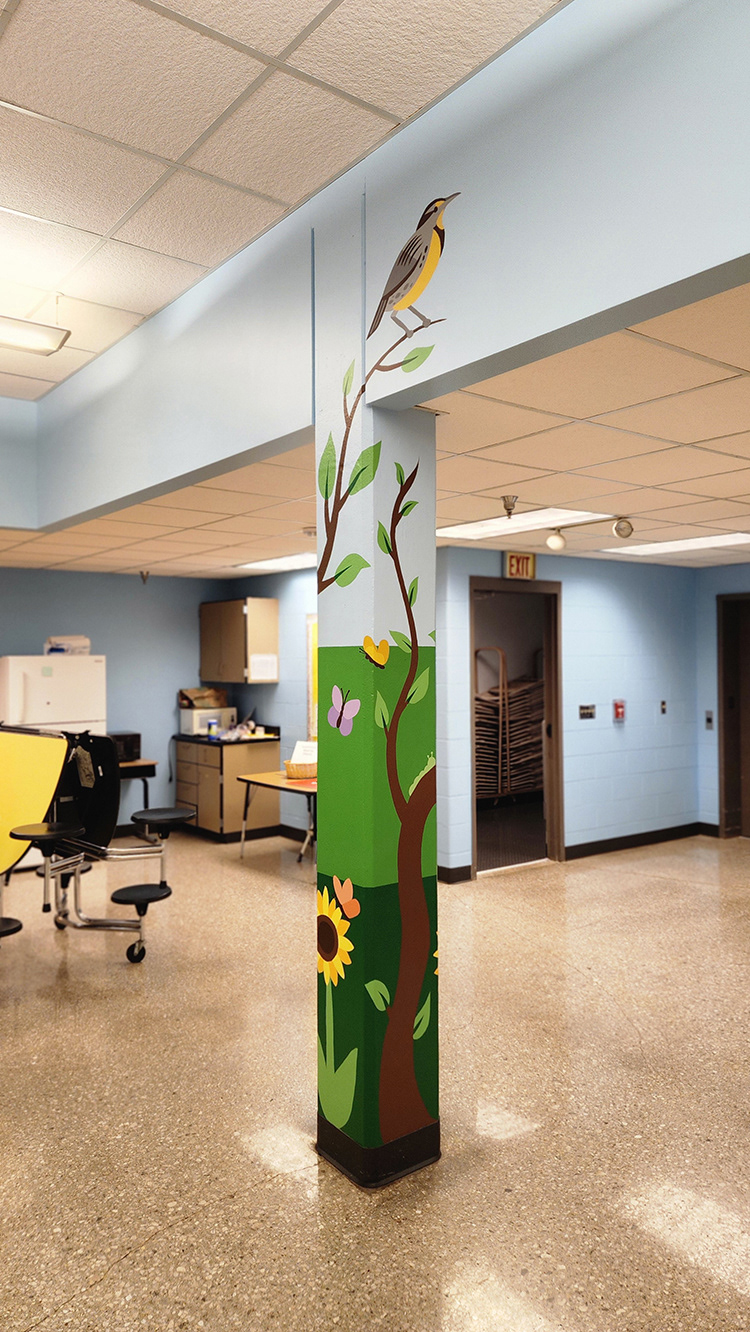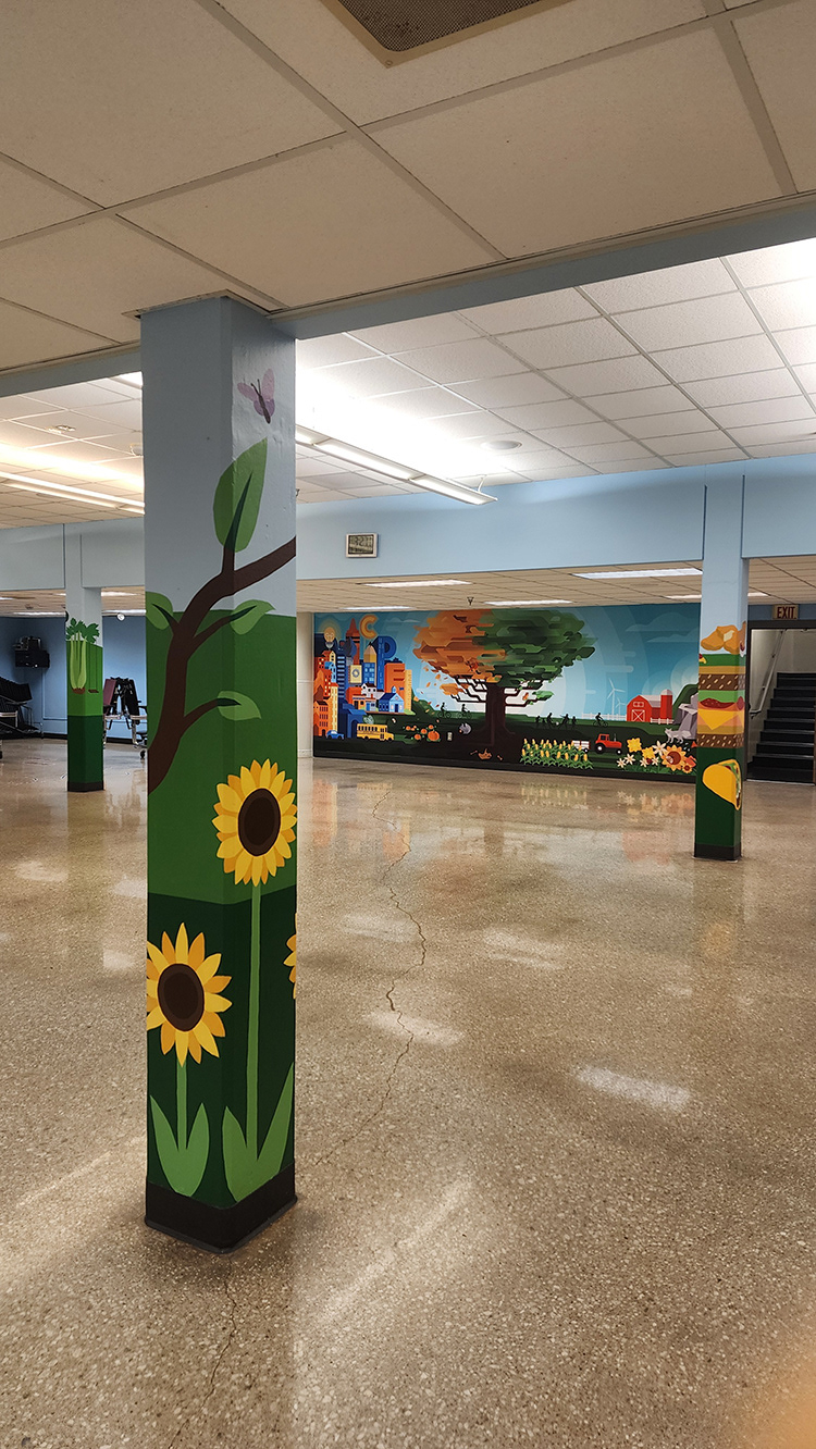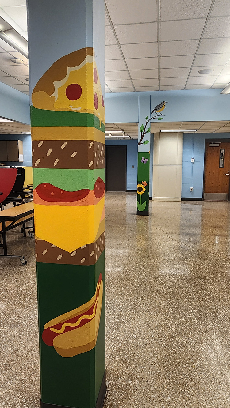 Our back-to-back school mural month continues at Cottonwood Point Elementary. This cafeteria refresh includes a custom digitally designed and installed wall graphic and four hand-painted pillars.