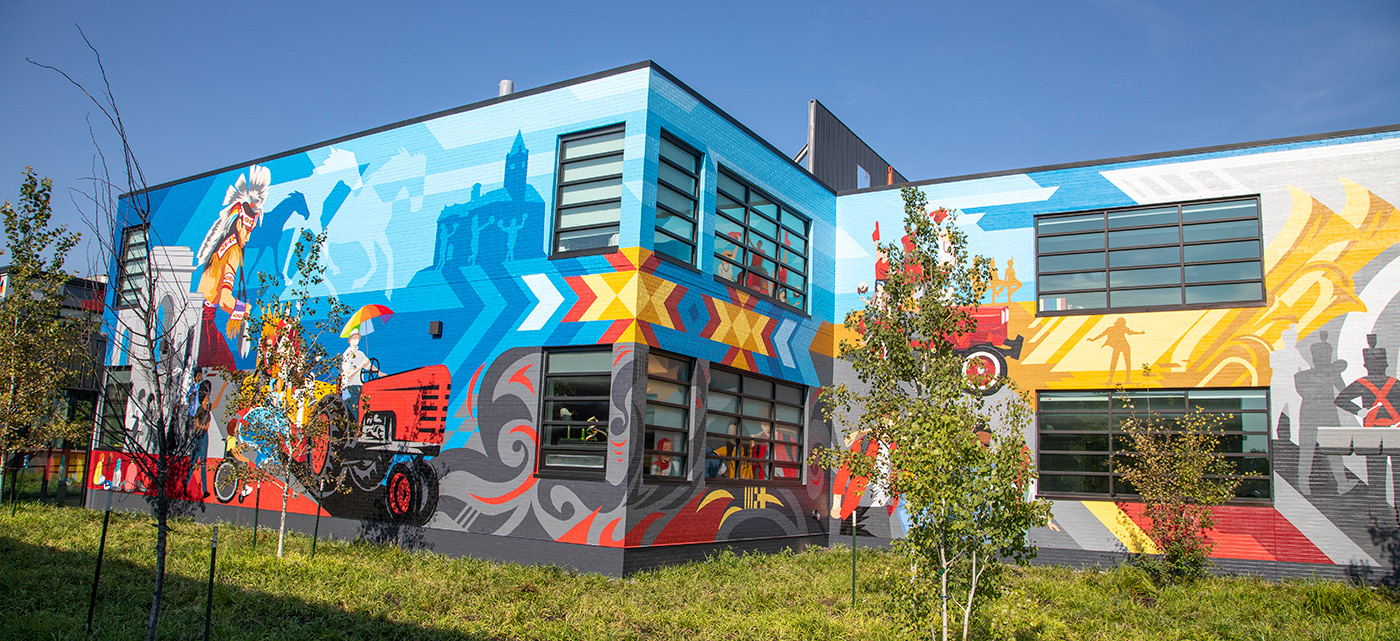 LHS, the original high school in Lawrence, Kansas, completed a massive renovation and addition in 2021. Upon completion of the redesign, it was important that the storied history, values, culture, and identity of LHS be celebrated. At over 16,000 sq ft, Sike Style Industries designed and painted a mural showcasing bright, inclusive, and dynamic imagery that inspires and speaks to the LHS experience.