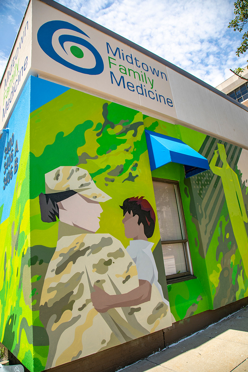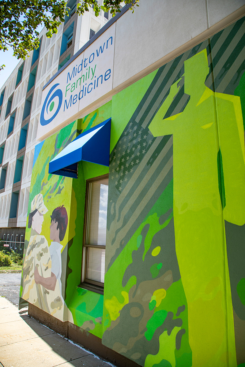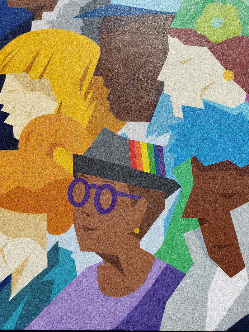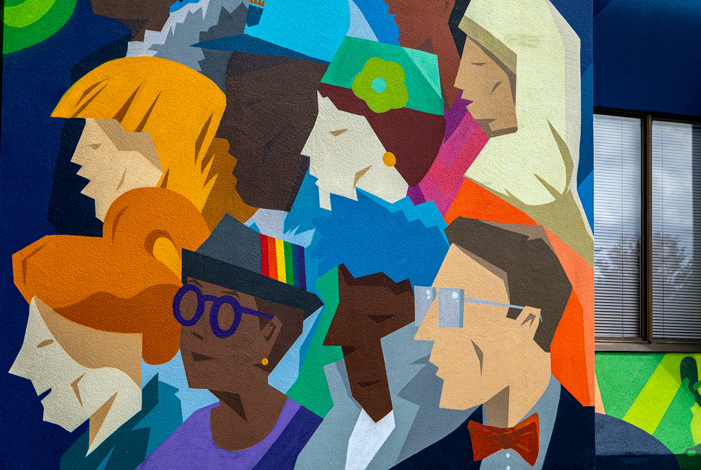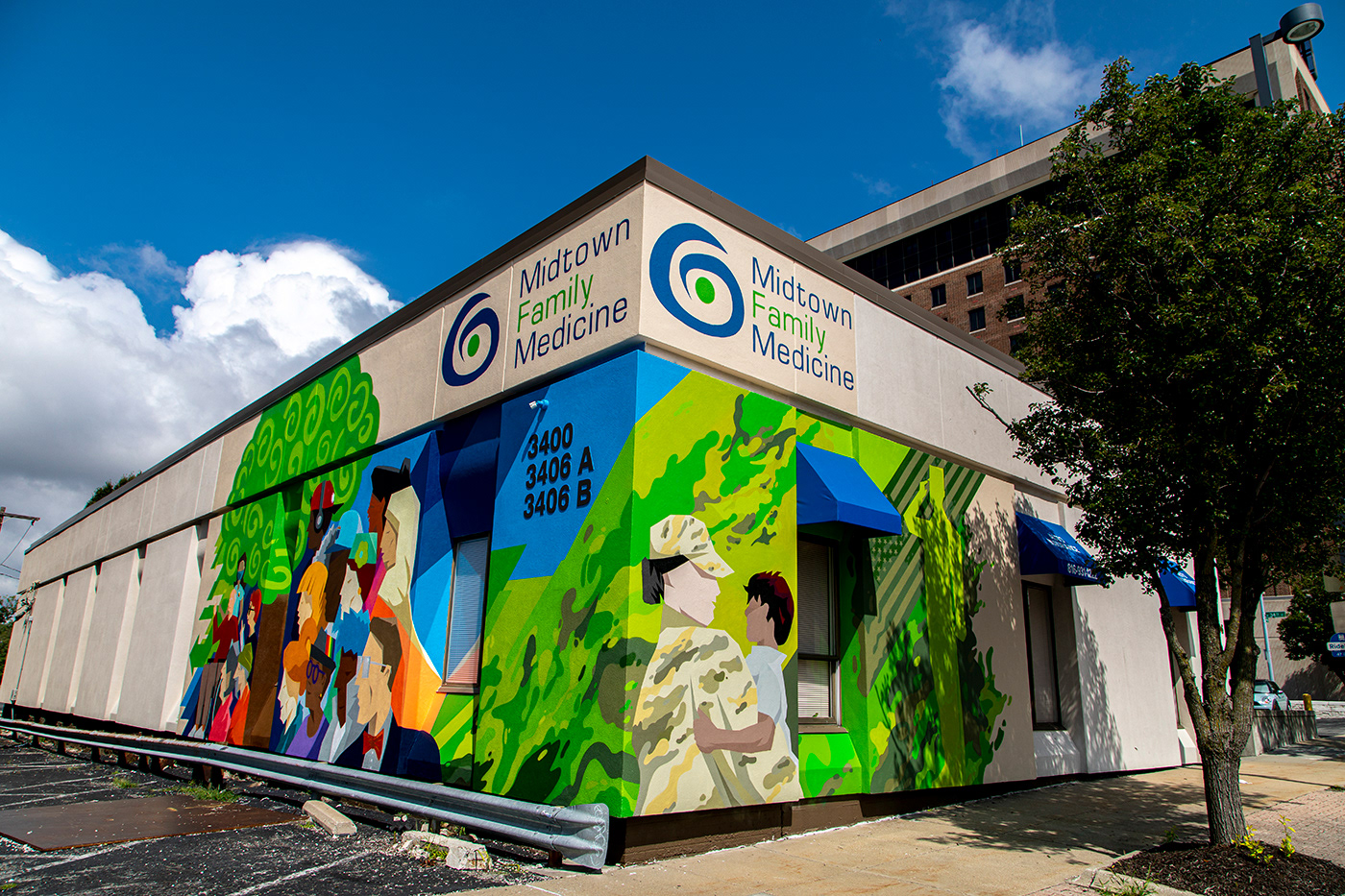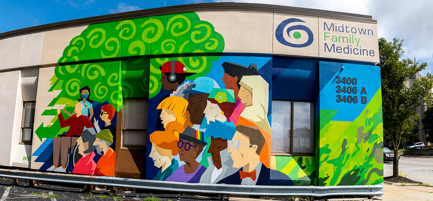 Mural depicting the diversity of patients that are served at the Midtown Family Medicine clinic in Midtown Kansas City.