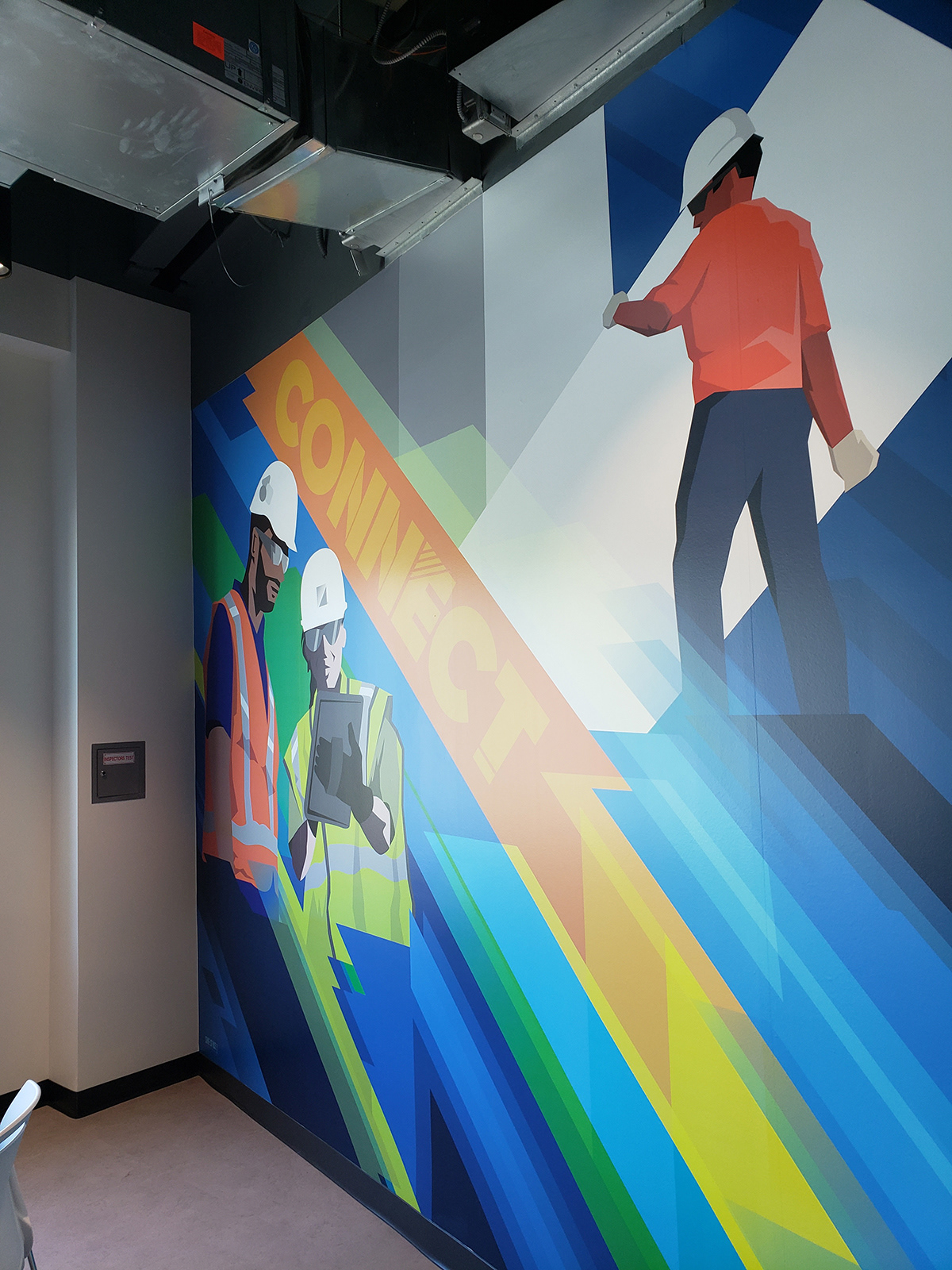 Office murals for the Performance Contracting Group HQ and training center in Lenexa KS. Art designed by Sike Style Industries with printing and installation by The Local Printshop KC. Themes include: coworker connectivity, skills development, safety culture, and hardhat helmet stickers.