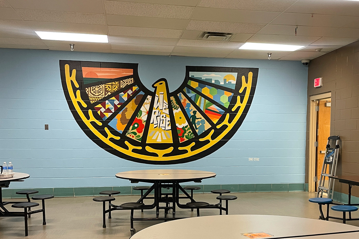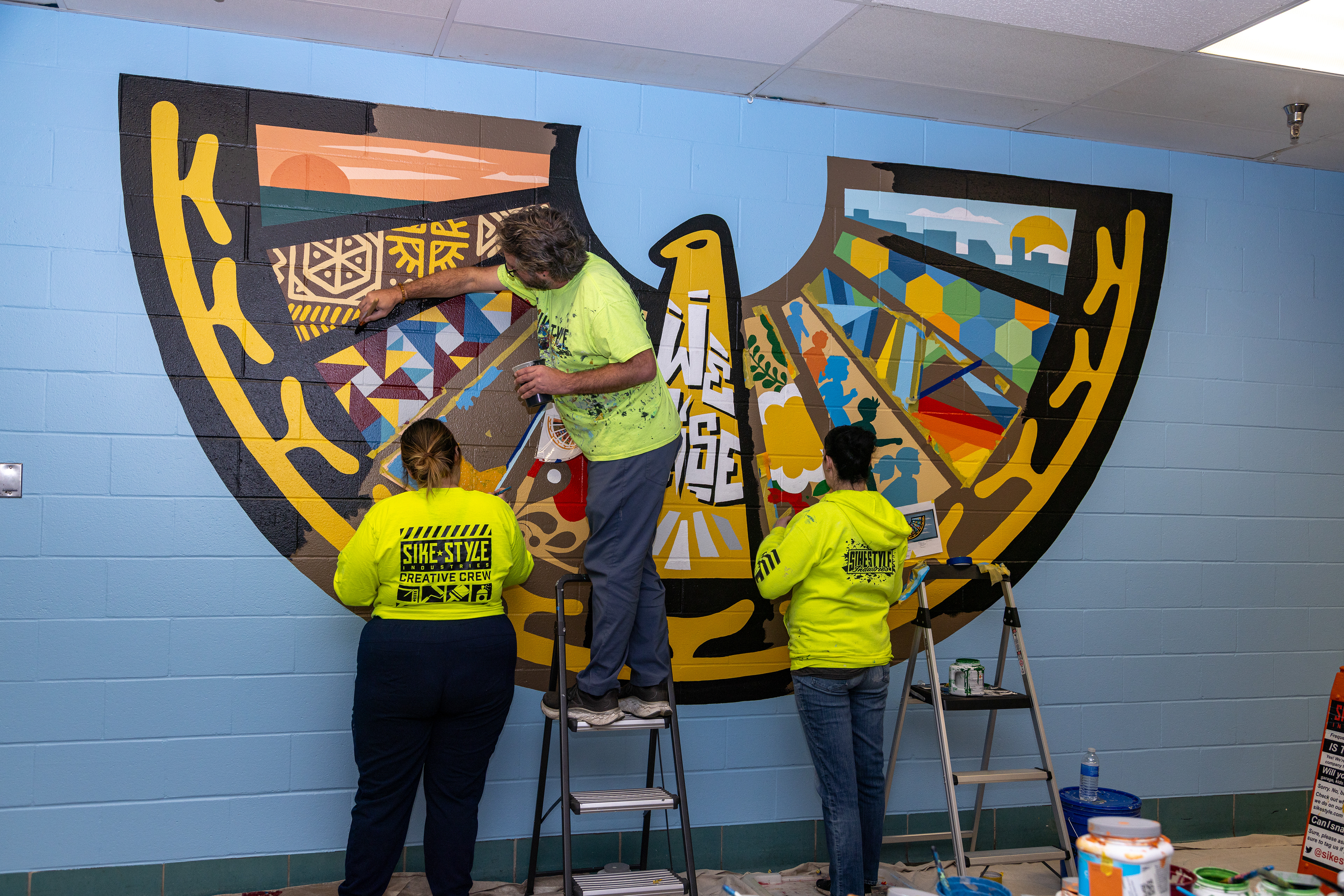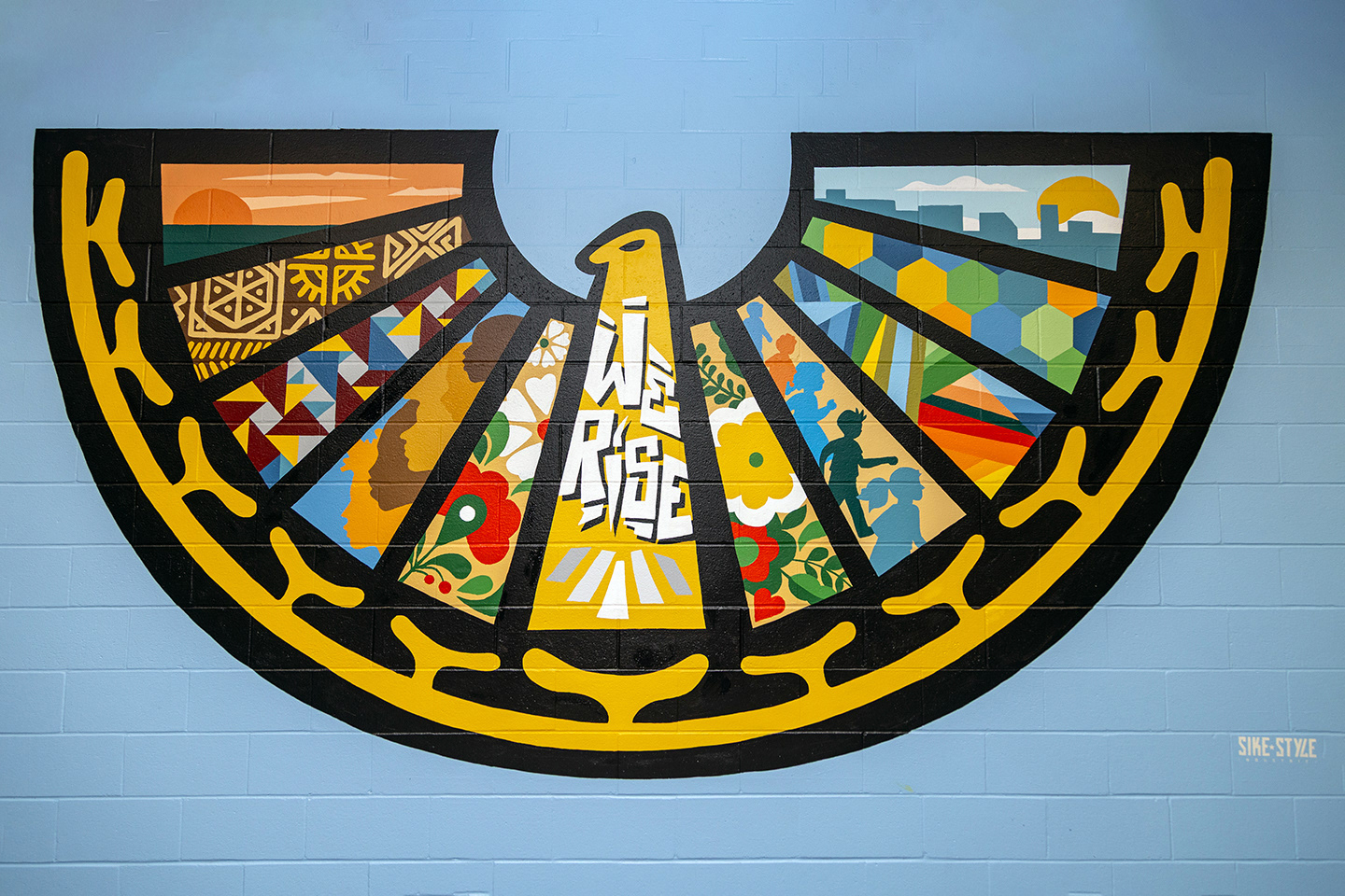 The MLK Day of Service tradition continues in 2026 as we partner with City Year KC to create a mural for Primitivo Garcia Elementary School on KC's Westside. This year's inspiration was taken from the school's theme "We Rise". The school's phoenix logo was the perfect starting point to add some patterns, kids, and color to its abstract geometric shape.