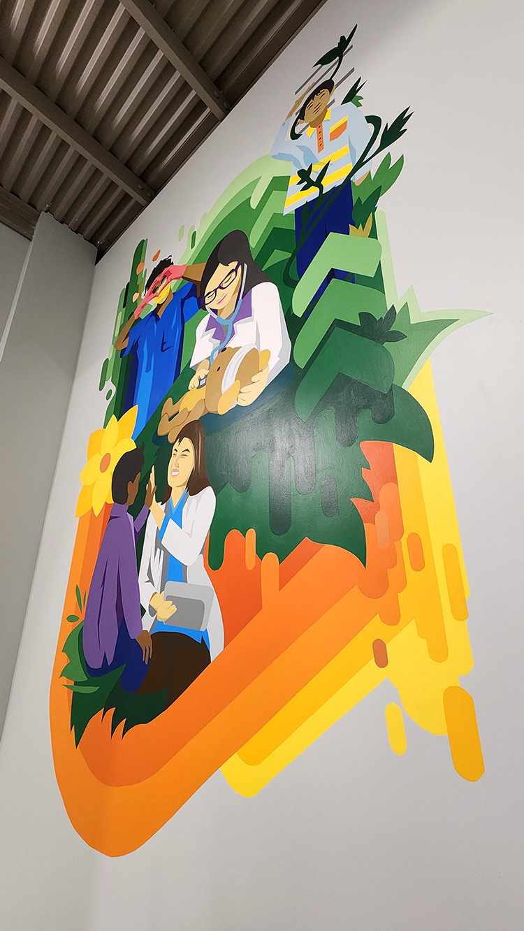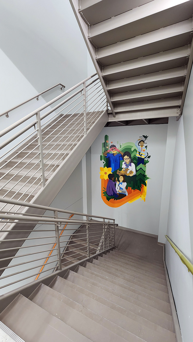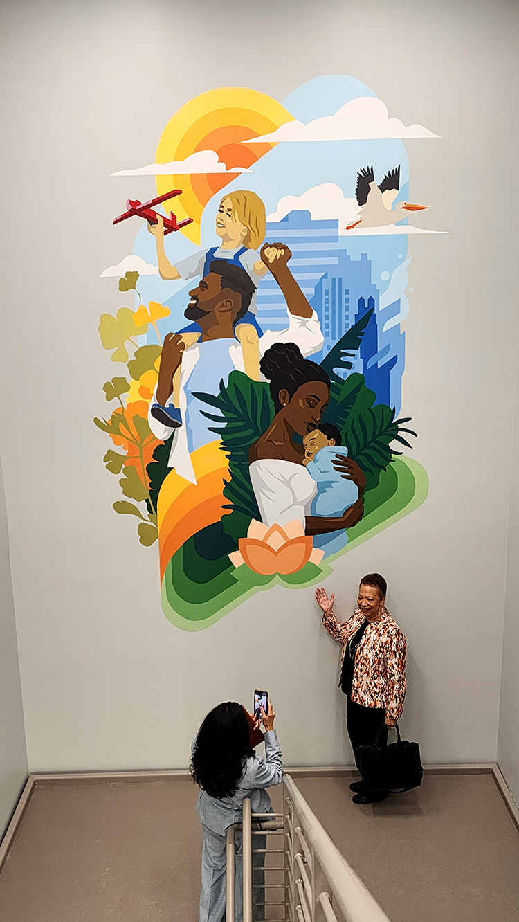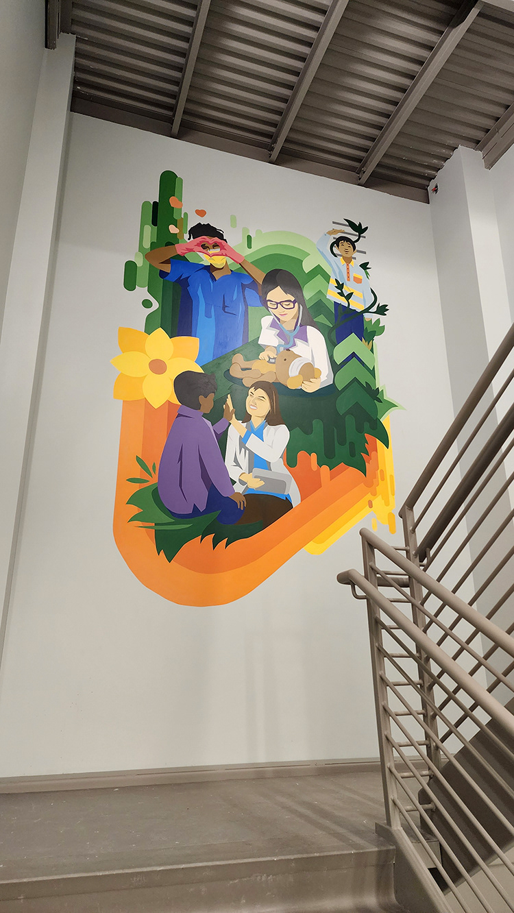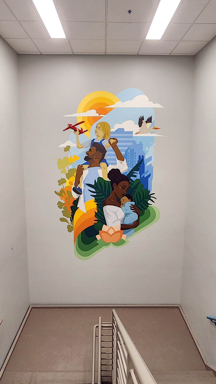 We designed and painted two stairwell murals, with the lower design depicting care workers with kids and the upper level focusing on families.