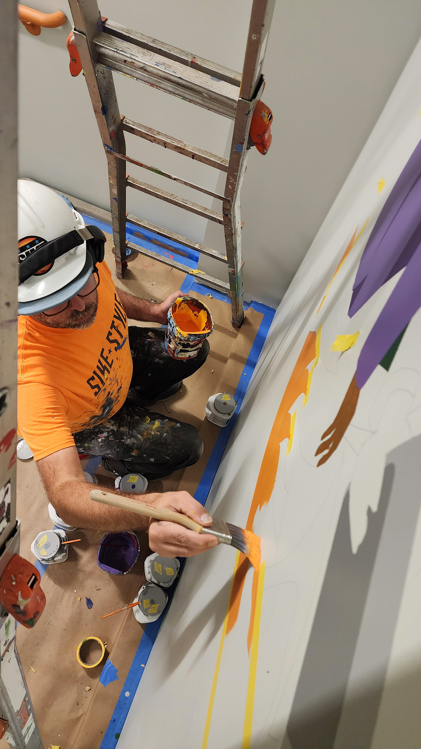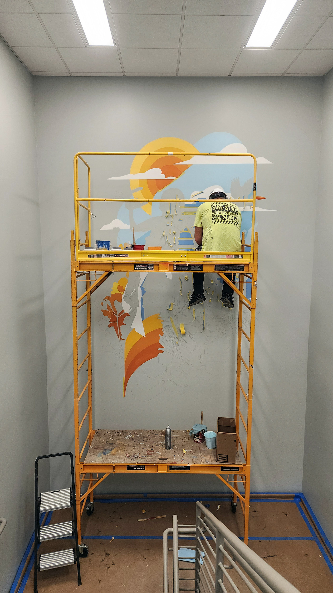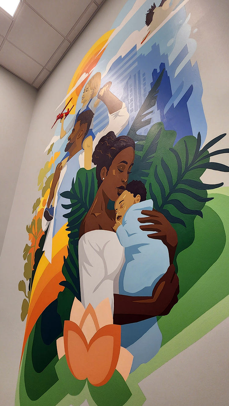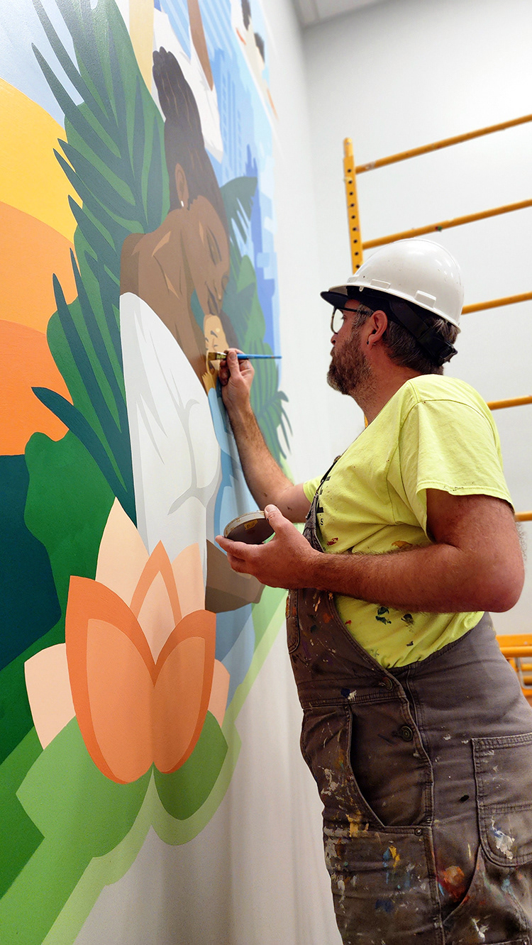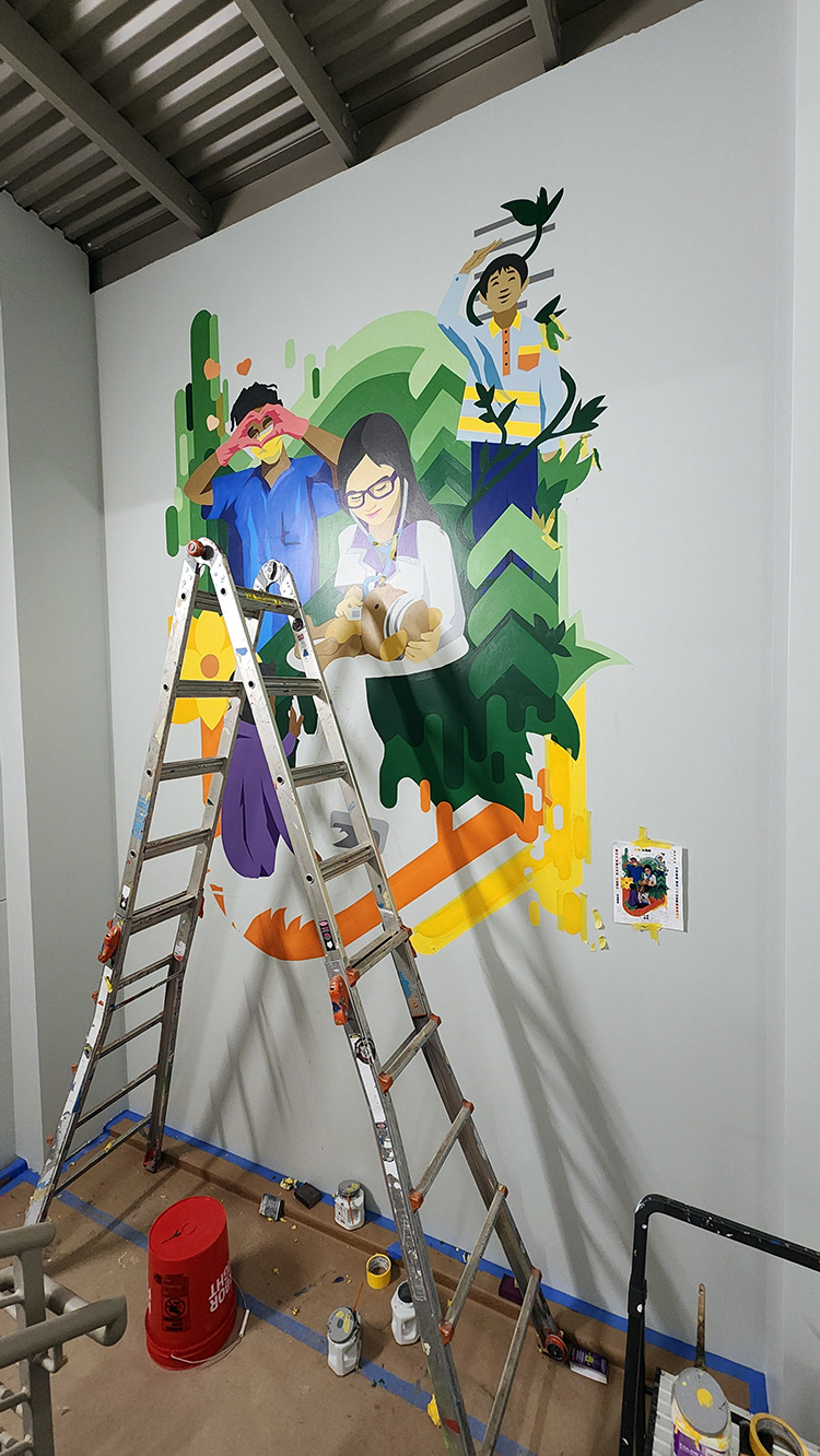 We designed and painted two stairwell murals, with the lower design depicting care workers with kids and the upper level focusing on families.