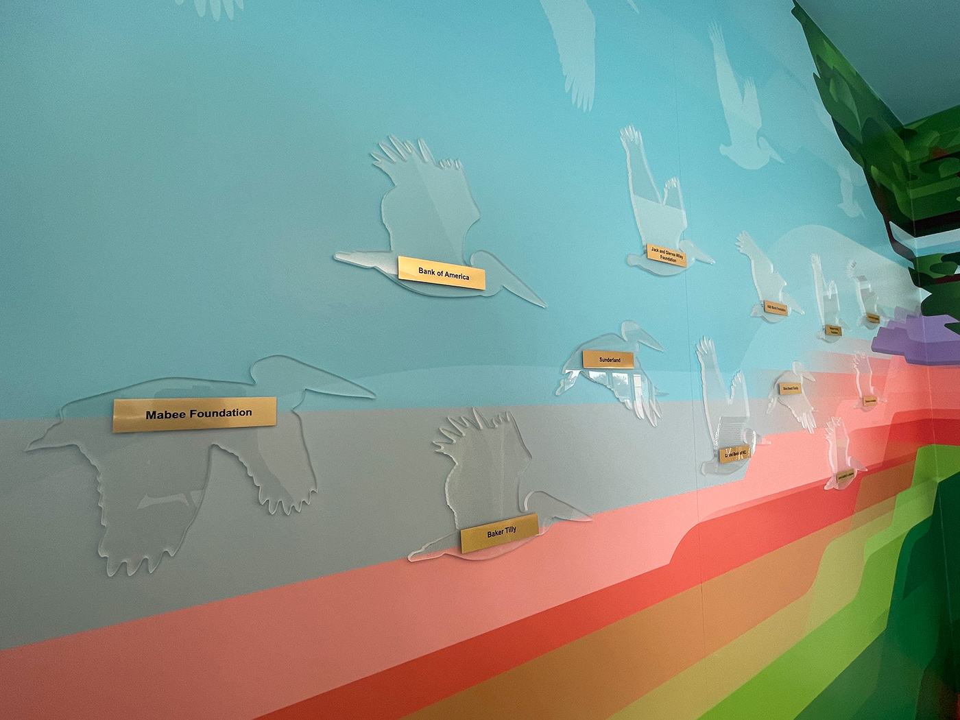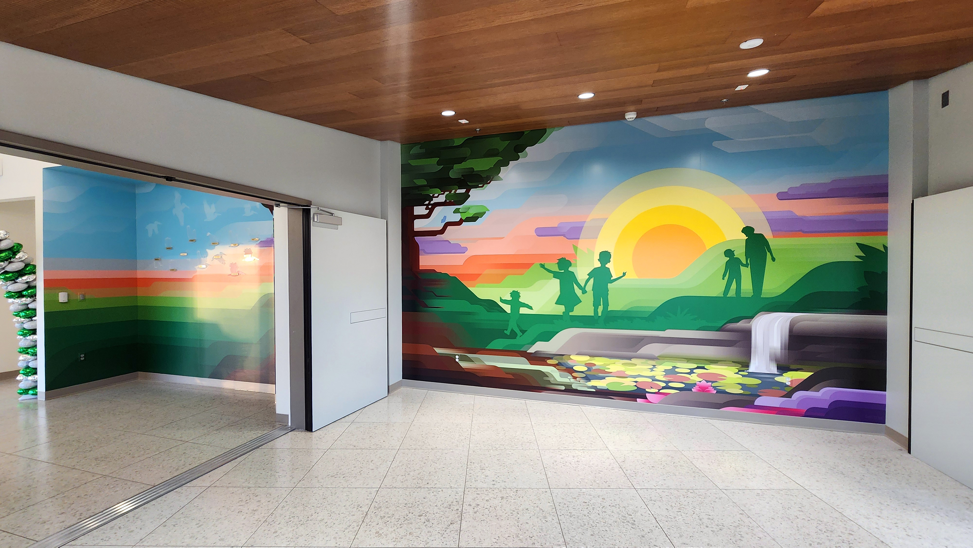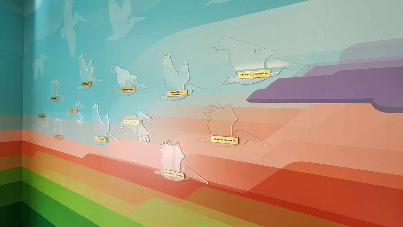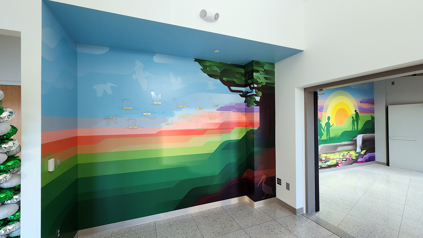 In the bridge area connecting the old building to the new wing are three custom designed and installed murals. A donor wall with custom acrylic pelicans, the main bridge mural features an abstract greenscape with kids and grandparents, and the window artwork is a vinyl on glass design that casts a detailed shadow that moves with the sun throughout the day.