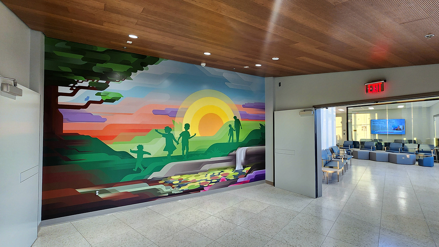Custom installed vinyl murals in the bridge connecting the new pediatric wing to the old building.